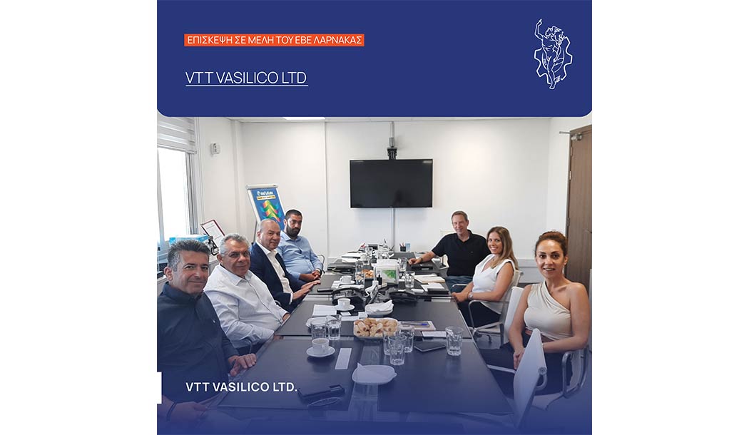 Αντιπροσωπία του ΕΒΕ Λάρνακας, αποτελούμενη από τον Πρόεδρο Δρ. Νάκη Αντωνίου, τον Αντιπρόεδρο Τουρισμού κ. Λουκά Λουκά, τον Διευθυντή του ΕΒΕΛ κ. Χαράλαμπο Ανδρέου, τον κ. Δημήτρη Χρίστου Λειτουργό του Επιμελητηρίου, και συνοδευόμενη από τον Γενικό Γραμματέα του ΚΕΒΕ κ. Μάριο Τσιακκή πραγματοποίησε επισκέψεις σε μέλη του στο Βασιλικό. Συγκεκριμένα, οι επισκέψεις έγιναν στις εγκαταστάσεις της VTT VASILICO LTD, και της ΕΚΟ CYPRUS LTD.